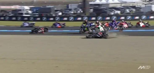 As the grid charged into the opening corner, Jorge Martín lost control of his bike and suffered a heavy fall. His sliding machine careered directly into teammate Marco Bezzecchi, leaving the Italian with no opportunity to evade the impact. The incident not only wiped Bezzecchi out instantly but also brought Aprilia’s challenge to an abrupt end before either rider had completed a corner.