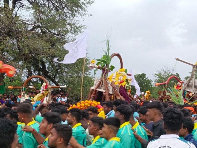 The palanquins from the seven keris of Hospet rushed towards Dharmadagudda in Nagenahalli, about 5 km away, afternoon. The youth carrying the palanquins almost ran towards Dharmadagudda. While the festival idol of Channabasaveshwara was placed in a palanquin prepared in the temple, the Nijalingamma of Banadakeri was placed next to it, the Huligamma of Masakeri and the Kongamma palanquin were placed next to it. On the other side, the palanquin of Rampur Durgamma Devi of Talavarakeri was placed.