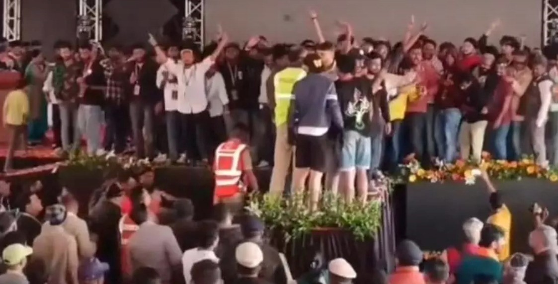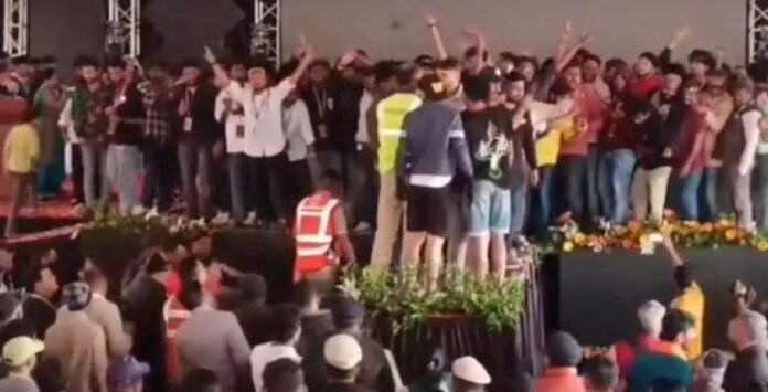 The chaos erupted at the Dasara cultural platform when dissatisfied participants stormed the stage, shouting “Fraud… Fraud” in protest over the prize decisions. They vandalized podiums, LED screens, sound systems, and lights, while also throwing gold and silver prizes from the stage and damaging 150 chairs.
