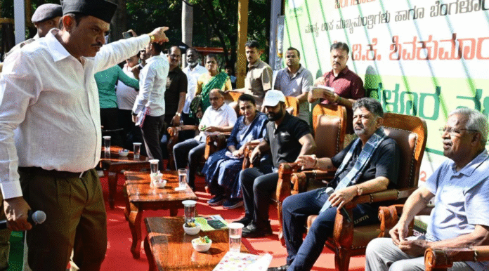 Munirathna, the MLA from Rajarajeshwari Nagar, arrived uninvited at the citizen outreach event dressed in an RSS uniform. As Mr. Shivakumar was about to begin a public grievance session after walking in the park for two hours, he noticed Munirathna in the crowd and jokingly called him “black cap” while inviting him on stage.