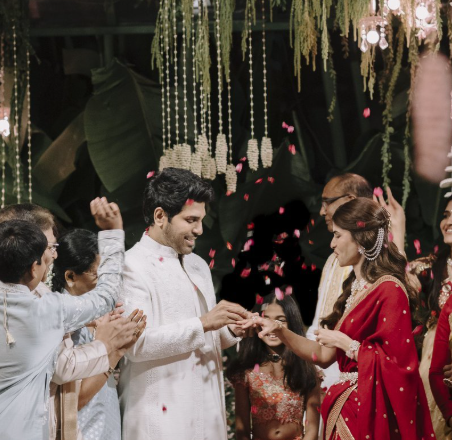 Allu Sirish, dressed in a stylish Manish Malhotra outfit, looked dashing next to Nayanika, who shone in an elegant Sabyasachi lehenga.