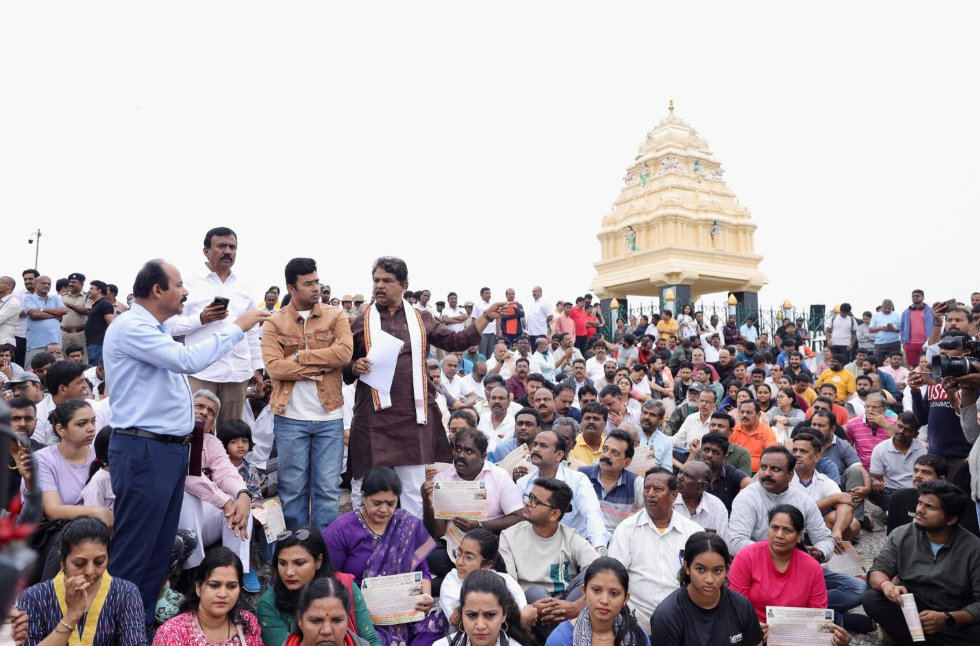 BJP leaders R Ashoka and Tejasvi Surya held a protest at Lalbagh on Sunday, opposing the Tunnel Road project under the slogan, “Save Lalbagh, Protect Bengaluru.” The protest, however, was not allowed by police, but the leaders still visited the site where the tunnel is planned.