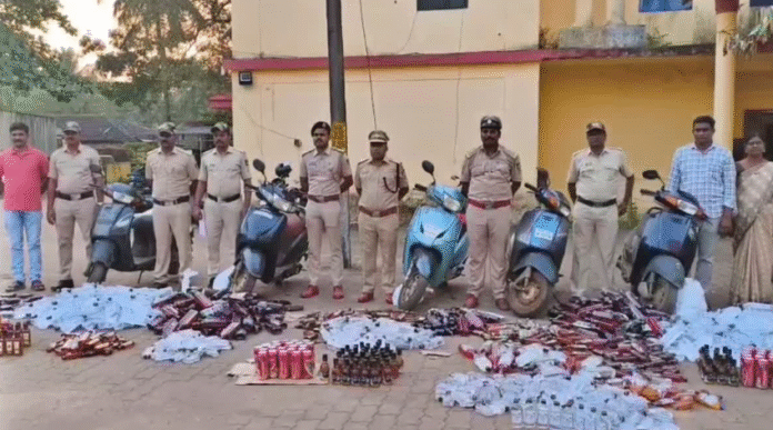 Karwar Excise Department officials intercepted a large-scale illegal liquor transport operation from Goa, seizing 649 liters of liquor and five two-wheelers worth a total of Rs. 7.62 lakh. The accused managed to flee the scene during the raid.