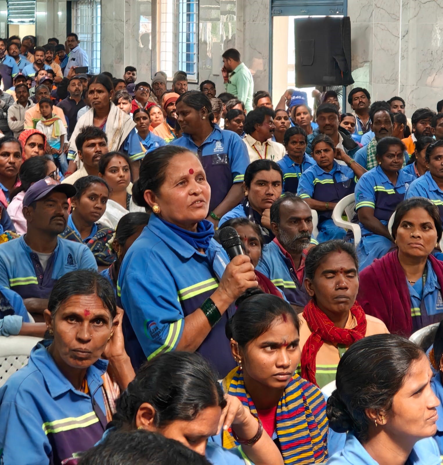 During the programme, pourakarmikas, loaders, cleaners, auto-tipper drivers and other sanitation staff shared their problems. They spoke about lack of basic facilities, recruitment delays, pending wages, PF issues, biometric attendance troubles, shortage of toilets, and delay in compensation to families of workers who died while on duty.