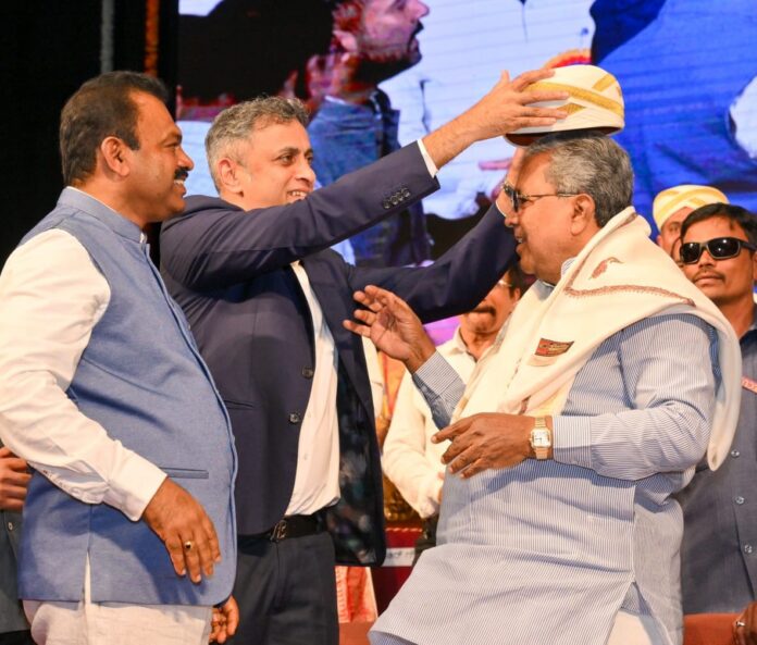Chief Minister Siddaramaiah being honoured at the 2024 Are Bhasha Academy Honorary Award Ceremony, organised by the Department of Kannada and Culture and Karnataka Are Bhasha Sanskriti and Sahitya Academy Madikeri, at Ravindra Kalakshetra in Bengaluru on Sunday
