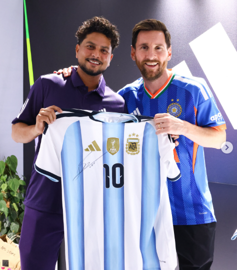 Indian spinner Kuldeep Yadav was gifted a signed Argentina football jersey by Lionel Messi during the football legend’s visit to Delhi as part of his “GOAT India Tour 2025.” The moment was shared on the official Adidas India social media handle, highlighting Kuldeep alongside other Indian athletes including Paralympic champions Sumit Antil and Nishad Singh.