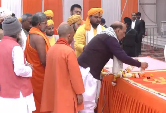 Rajnath Singh arrived in Ayodhya earlier in the day for the Pratishtha Dwadashi programme and was received at Maharishi Valmiki International Airport by Chief Minister Yogi Adityanath. Together, they participated in temple rituals, including hoisting the religious flag atop the Maa Annapurna temple. Devotees greeted them with chants, and the Chief Minister blessed children present at the site.