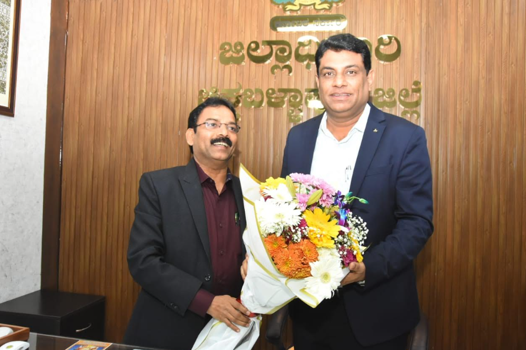 The immediate past District Commissioner, P.N. Ravindra, officially handed over charge to G. Prabhu and extended his best wishes by presenting a bouquet of flowers. In a gesture of mutual respect, the newly appointed District Commissioner reciprocated by offering a bouquet to the outgoing officer and accorded him a ceremonial welcome, acknowledging his service to the district.