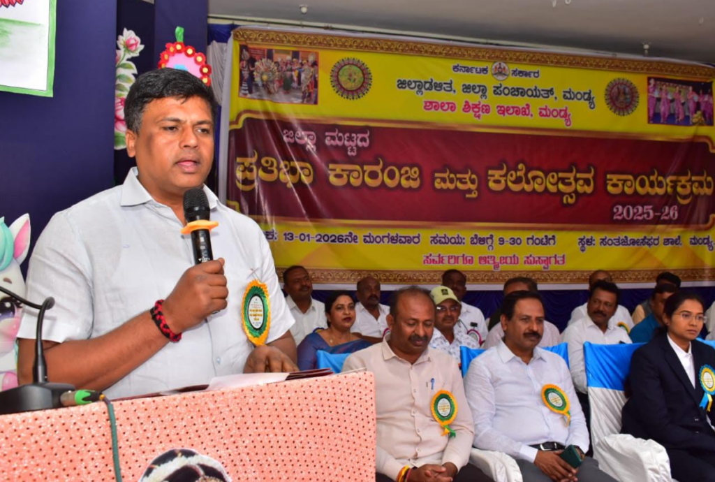 Children can achieve success only when their innate talents are recognized and nurtured, said Mandya Assembly constituency MLA Ravikumar. He was speaking at the inauguration of the 2025-26 District-Level Pratibha Karanja and Cultural Festival organized by the District Administration, Zilla Panchayat, and Mandya School Education Department at St. Joseph’s High School campus in Mandya. The event was inaugurated by lighting a ceremonial lamp.