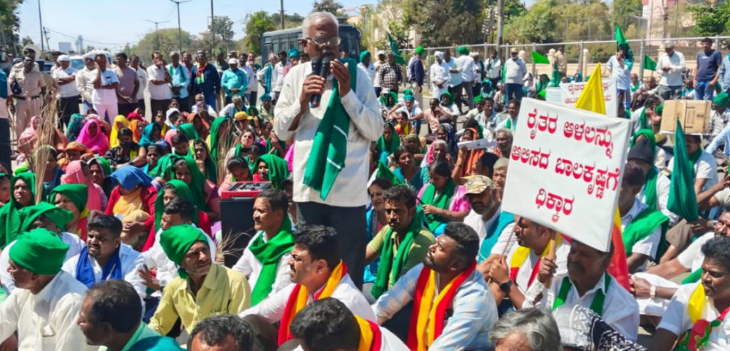 They shouted slogans against large scale land acquisition, saying fertile land in Bidadi Hobli, Bhairamangala, and Kanchagaranahalli is being taken in the name of development.