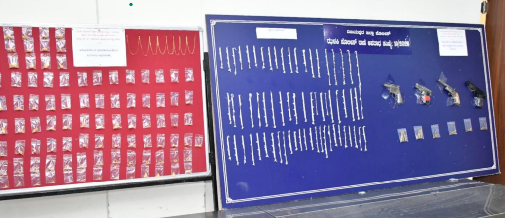 According to police, the robbery occurred on January 26 at around 3.30 pm at ‘Bhoomika Jewellery’ shop owned by Maharudra Sadashiv Kanchagar in Halasangi village. Two masked individuals, their faces covered with black cloth and wearing helmets, arrived on a black Honda Unicorn motorcycle. The accused allegedly threatened the shop owner at gunpoint and fled with 205 grams of gold ornaments and 1 kilogram of silver ornaments, collectively valued at approximately ₹22 lakh.
