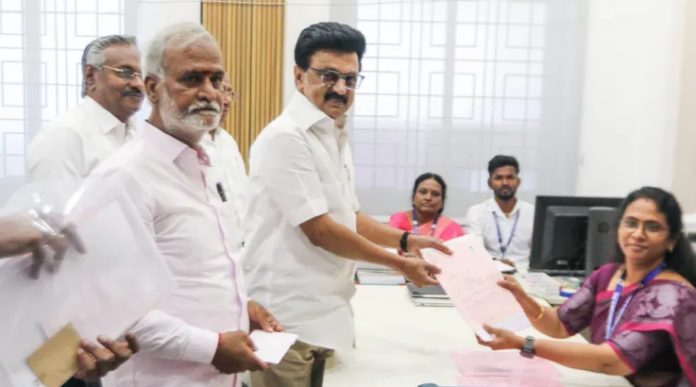 Stalin submitted his nomination papers at the designated office on Paper Mills Road before Returning Officer S. Shanthi. Senior leaders, including Minister Sekhar Babu, were present during the filing. The event drew large crowds, with party workers and supporters gathering in huge numbers.