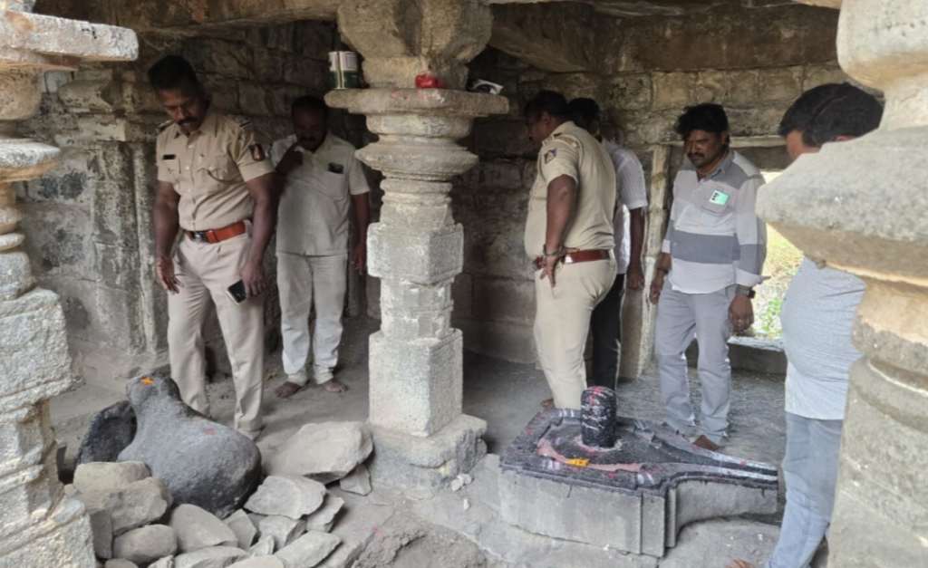 In a shocking incident, an ancient temple in Badadal village of Afzalpur taluk was vandalised by miscreants searching for hidden treasure. Idols of Lord Shiva, Nandi, and Lord Hanuman were damaged, and the premises were dug up. Police officials, including CPI Lakhan Masaguppi and PSI Somalinga Odeyar, inspected the site. Villagers said this was the third such attempt and urged strict action and restoration of the temple.