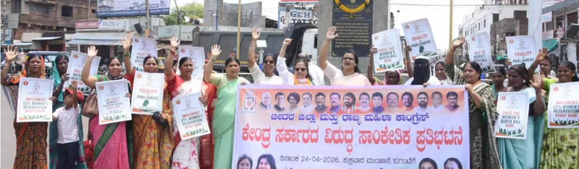 A symbolic protest was staged at Bidar at Ambedkar Circle by the District Women’s Congress and State Women’s Congress, demanding immediate implementation of the Nari Shakti Vandana Adhiniyam–2023 without delay or confusion.